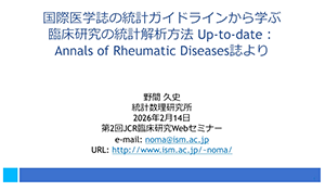 JCR臨床研究推進委員会では、臨床研究推進の一環として、2023年に第1回臨床研究WEBセミナーを開催いたしました。ご好評をいただき、このたび第2回を開催する運びとなりました。膠原病・リウマチ領域ではまだ馴染みの少ない統計手法や研究デザイン、最新のトレンドなどについて、疫学専門家および生物統計家の先生方に、講義動画やWEBセミナーを通してわかりやすく解説いただきます。