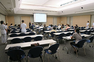 中央のスクリーンの歌詞を見ながら歌っている参加者、スタッフ、ボランティア