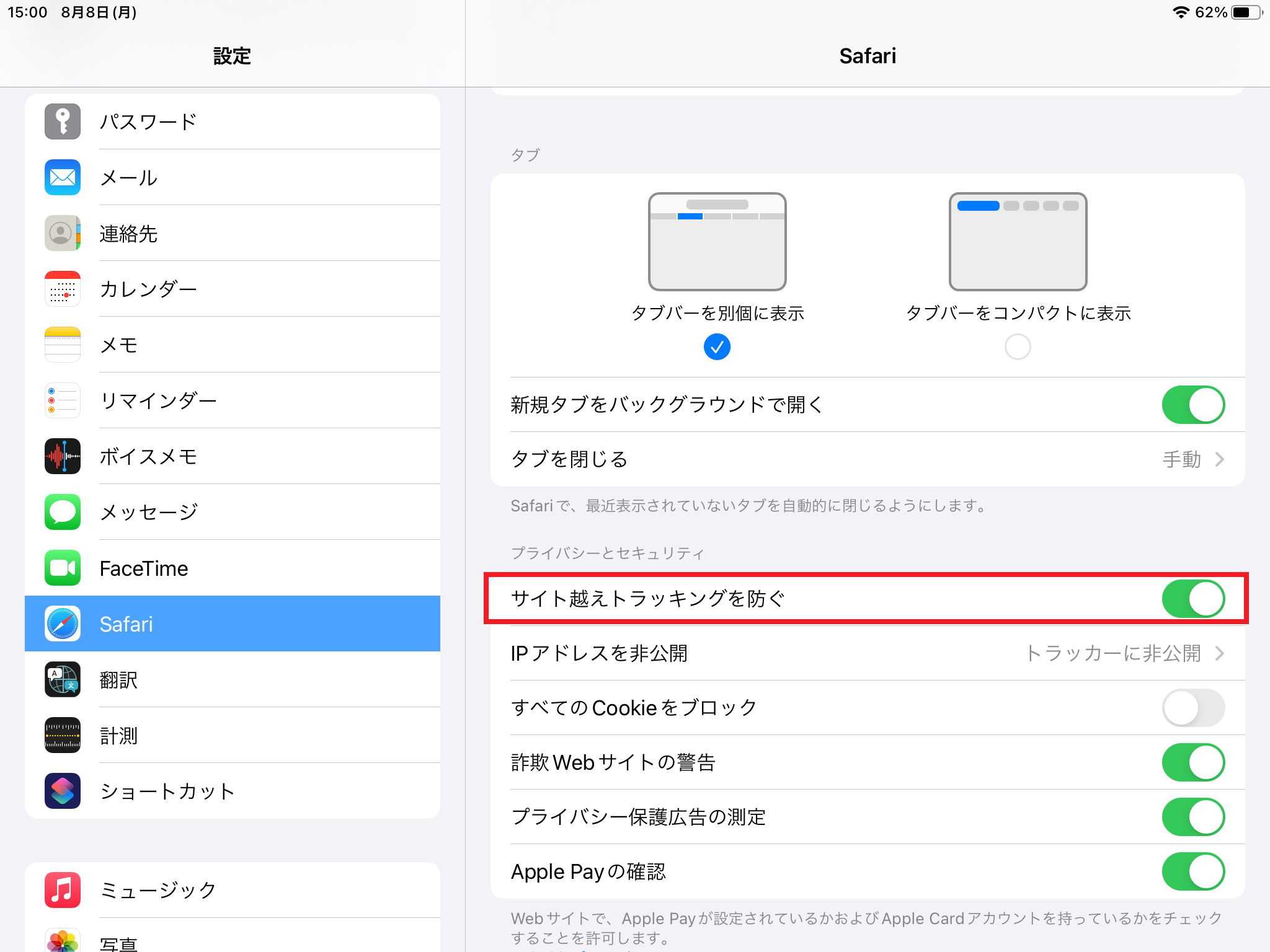 設定より、「Safari」→「サイト越えトラッキングを防ぐ」をオフにする